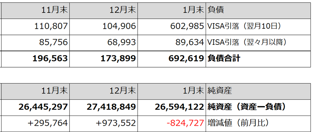 前月末の純資産から824,727円減って、純資産は約2,659万円でした。