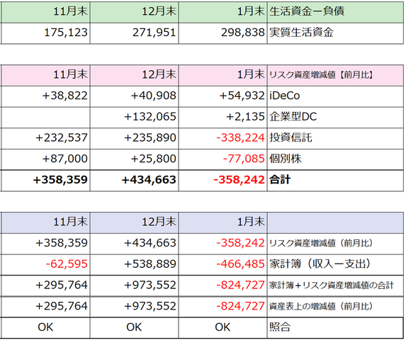その数字にリスク資産が減った分-358,242円を加えると-824,727円。