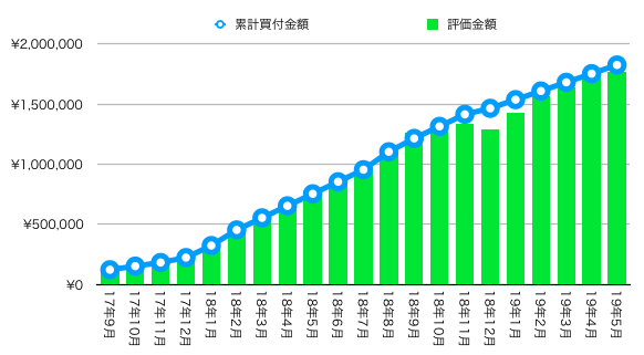 黄緑色の線(評価金額)が水色の線(累計買付金額)を追い抜いて成長していく日が待ち遠しい。