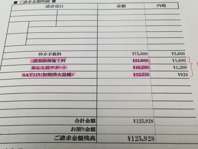 消臭除菌施工料=21,600円…契約後鍵を受け取って部屋に入ったら、内覧した時に玄関床に貼ってた「清掃済み」の紙の上の埃も水回りの埃汚れもそのまま。契約後に消臭除菌を施工した気配がなかった。