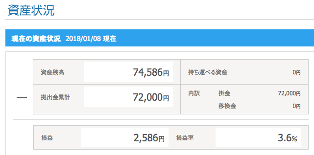 昨年5月末から始めた投資信託の積み立て→[2017/05/30 投信積立完了] 、最初は月に1万円から、慣れて来て徐々に積立額を増額して、現在月に10万円に増額して、現時点での残高はこうなってます。