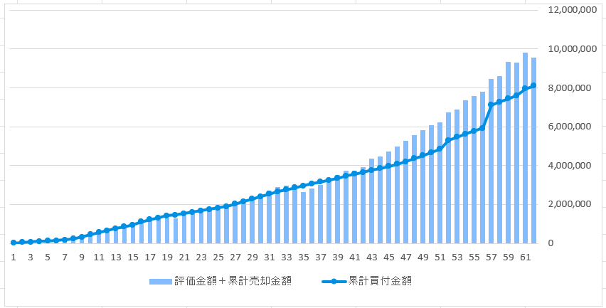 57ヶ月目に累計買付金額が急に上がっているのは、投信積立をはじめた時からずっとコツコツ積み立てていた8資産均等型のバランス型ファンドを売却してその資金で株メインのインデックスファンドを買い直したからです。