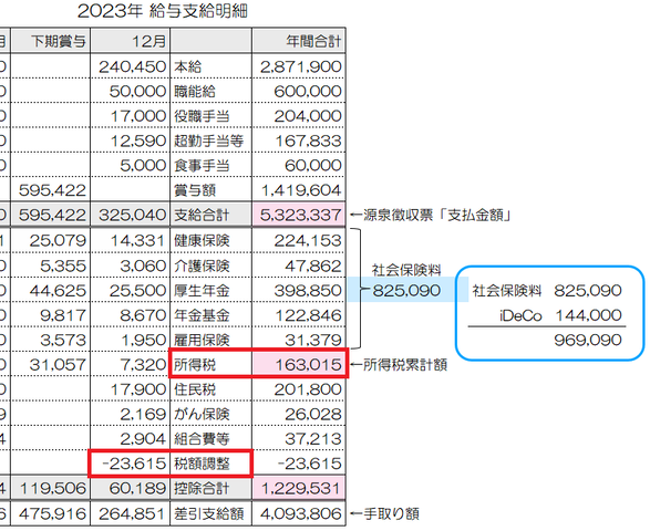 この表の通り163,015円でしたので、給料から天引きで控除された所得税163,015円から、本来払うべき所得税(=源泉徴収税額)139,400円を引いた差額23,615円が年末調整で給料と一緒に還付されました。