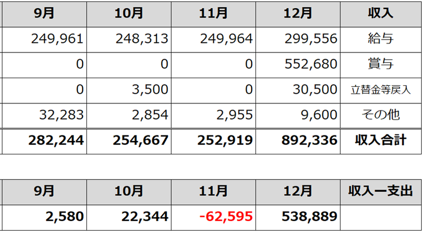 プラス 538,889円帰省や趣味娯楽費の出費が多かったものの、下期賞与分がそのままプラスとなりました。