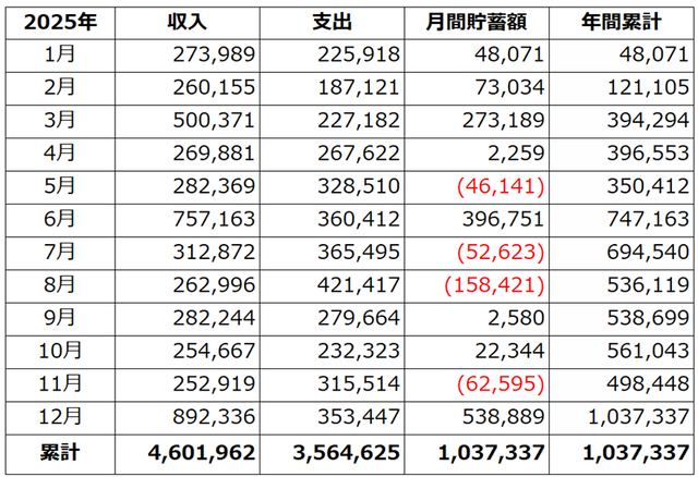 2025年も前年同様、年内4回帰省・今しか楽しめないイベント参加・健康第一を優先し、貯金額には目標を定めず過ごし、それでも年間で100万円貯金できました。