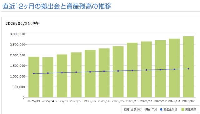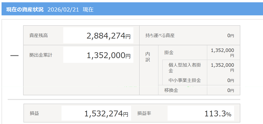 積立金(拠出金累計)に対しての評価額(資産残高)が今月もまだ2倍超えをキープしています。