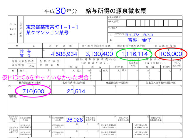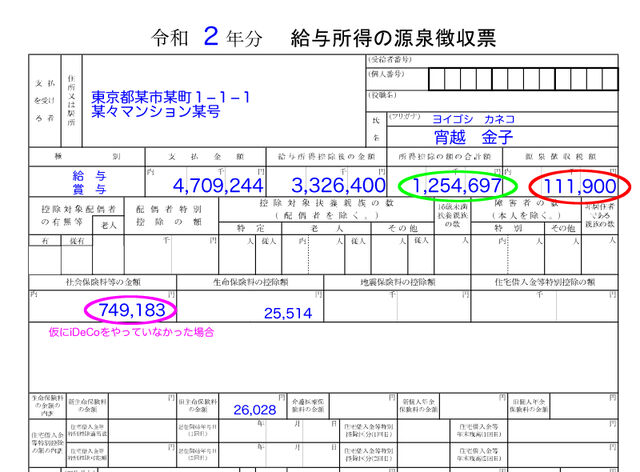 iDeCoの節税効果を具体的な数字で見るため、iDeCoをやってなかった場合の数字を源泉徴収票に書き加えてみました。