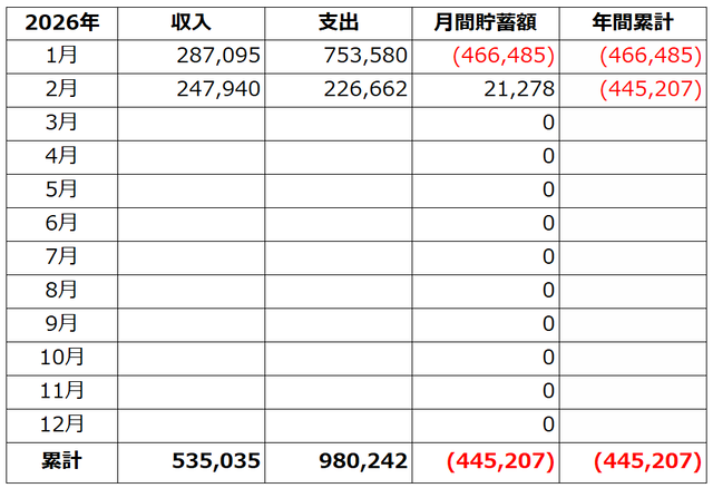 1月に支払った自動車教習所の入所代53万円が大き過ぎて年間収支累計の赤字継続中です(笑)